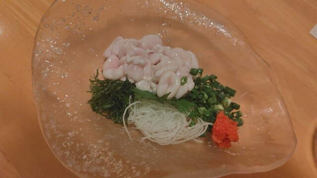 豆腐サラダ、ヤリイカの刺身、カツオのたたき、ヒモの天ぷら、海鮮の味噌焼き、いちご煮雑炊をオ...