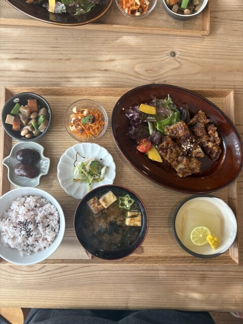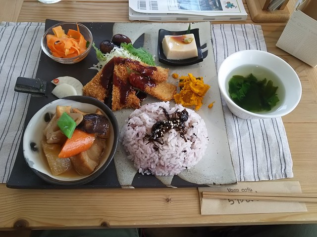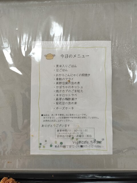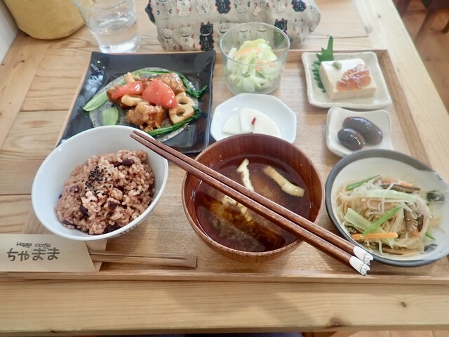 青森市緑。中央大橋通りと金沢小学校通りの交差点あたりから緑道を抜け正面の【ベジカフェちゃまま】さん。〈酵素玄米Bセット〉野菜メインのおかず5品に酵素玄米ご飯、お味噌汁とドリンク付。2023年4月中旬...