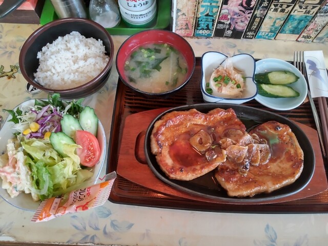 若布の味噌汁で口を湿らせてから。ナイフとフォークで分厚いトンテキをカットしてパク...