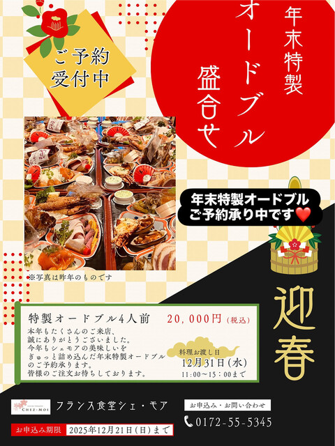 老舗ながら、アットホームな雰囲気を大切にしております。ご友人やご家族と、もちろんカップルでも、いろいろなシーンにご利用ください。お料理は地元の素材をふんだんに使った創作フレンチ。シェ・モアならではの味をゆっくりとご堪能ください。