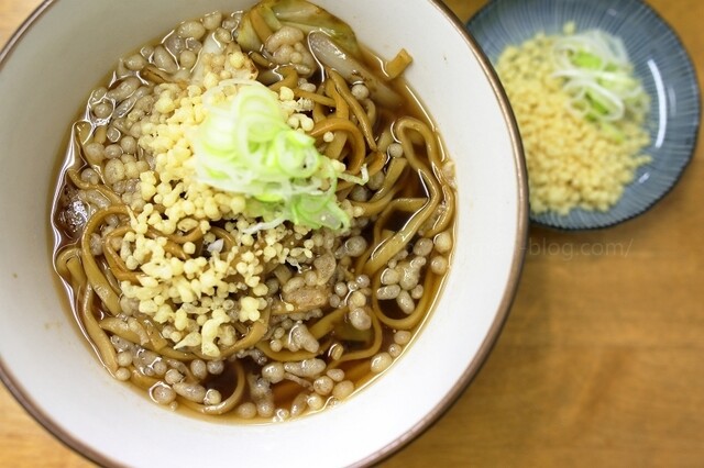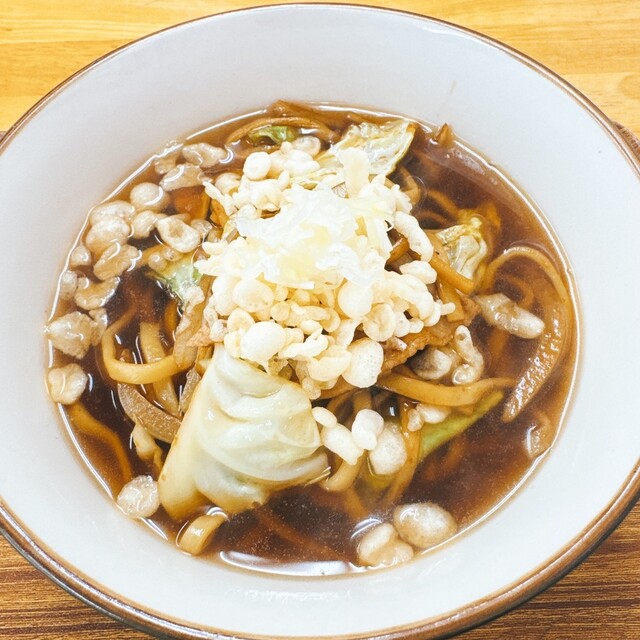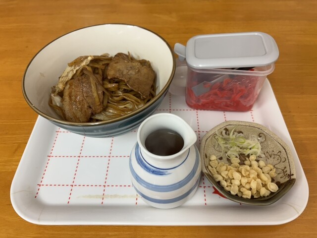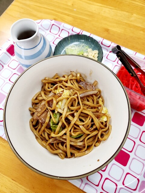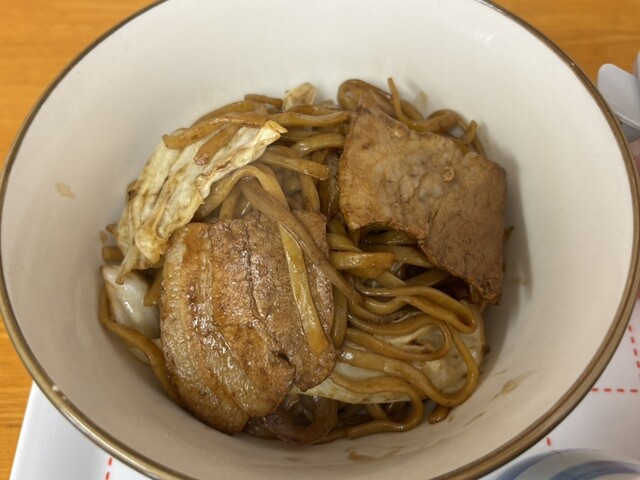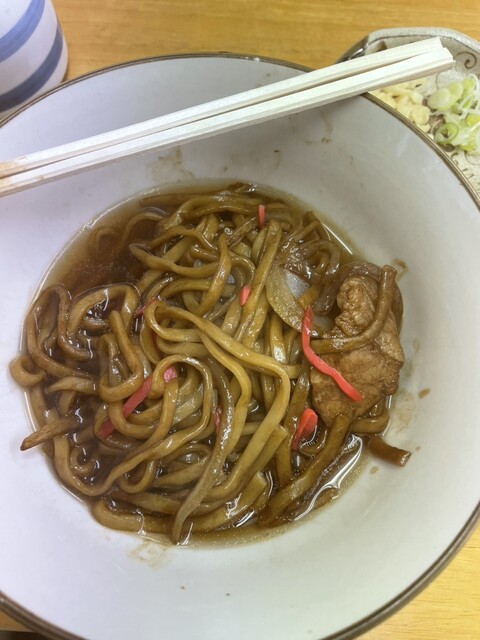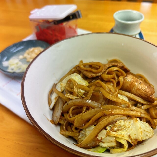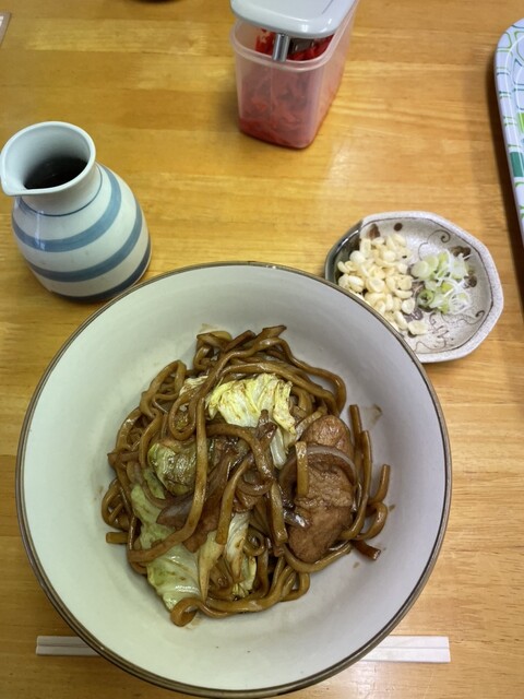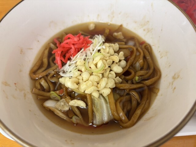 最初は黒石やきそばとして提供され、途中からつゆや薬味を加えてつゆ焼きそばにするスタイルで店オリジナル
