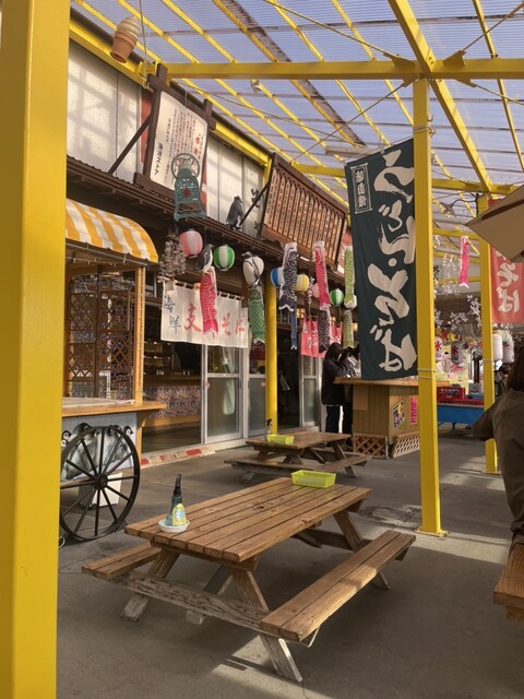 店内(売店前)、店外に雰囲気のある木製テーブルが数個配置。店外と言ってもしっかり屋根がありますよ。
