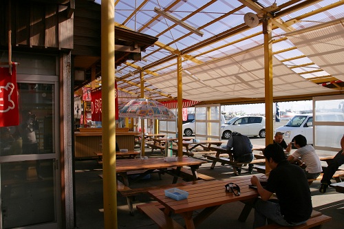 黄色い看板が目立ちます。駐車場はお店の前に斜め駐車が基本。その他、漁港関係者に迷惑のかからない範囲内で整頓して駐車しましょう。