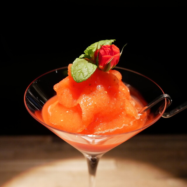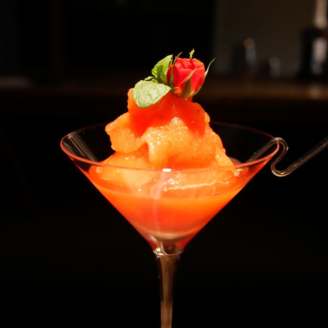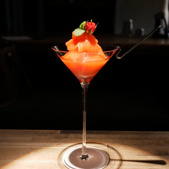 キウィのカクテルは、粘度があり、キウィのフルーツ感をダイレクトに感じられるフルーツカクテルでした。食後にぴったりでした。キウィの種がいいアクセントでした。店名通り、緑の中に咲くバラがきれいでした。、