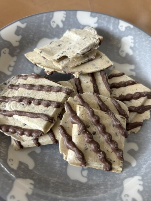 普通の南部せんべいより薄く焼いてあって食感が軽く、せんべいの黒ゴマの香りと少しの塩味にチョコがよくマッチしていて、もう一つもう一つといつのまにか...