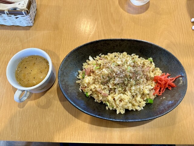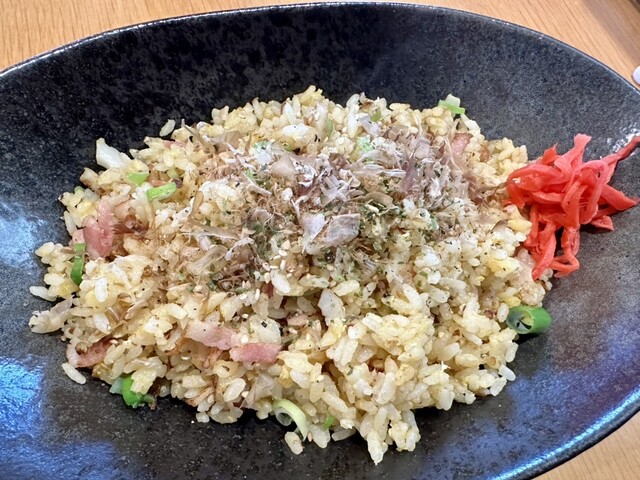 先ずはチャーハンですが炒め具合はパラパラ系で鰹節がトッピングされた和風テイストで味...