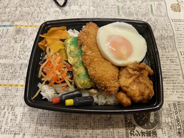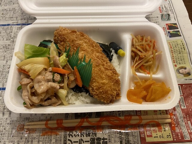 中々濃いめ目の焼き肉、晩酌には最高ですね。白身魚フライデカくサクサクで食べ応えあり。ホテルの周りにスーパーがないのでお弁当屋がとてもありがたいです。