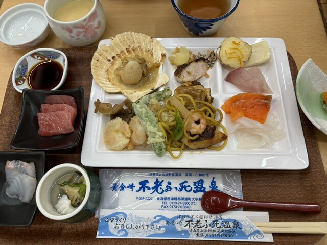 さて、夕陽が望める絶景の宿「黄金崎不老ふ死温泉」でいただいたお食事の様子をご紹介。