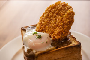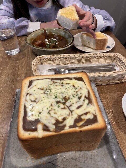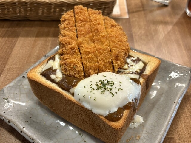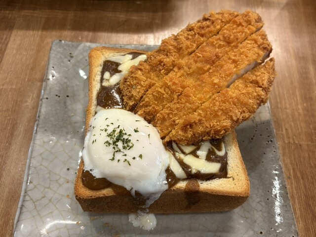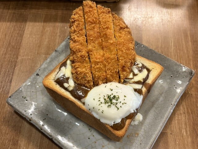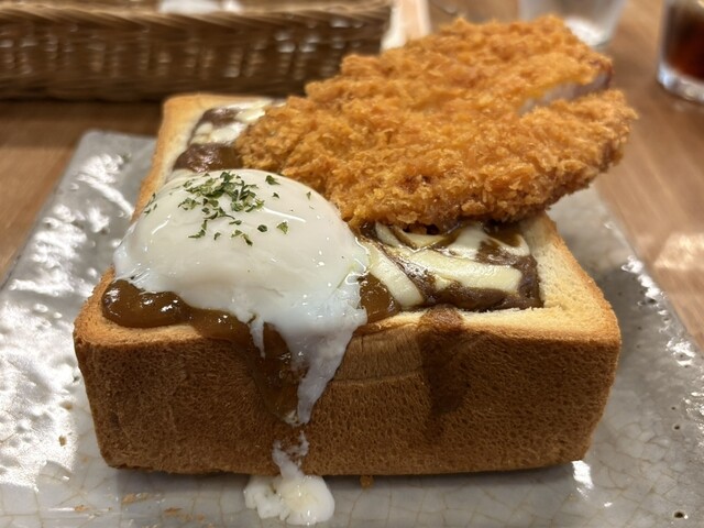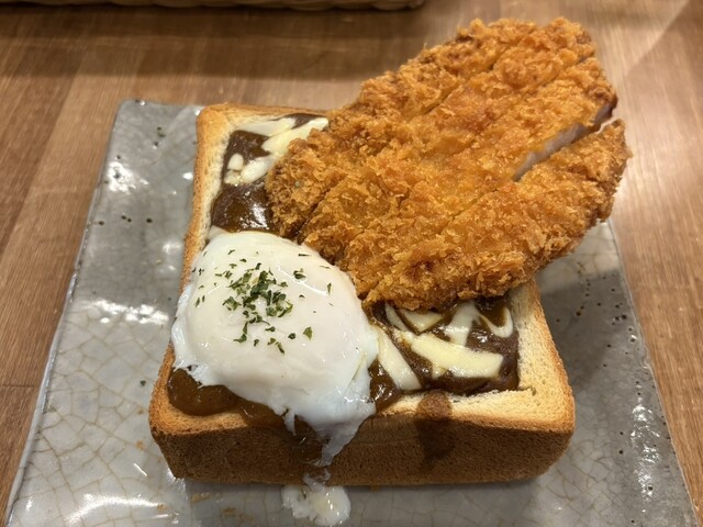 カツカレージャンボトーストを注文。器がトースト、中にカツカレー?と斬新な組み合わせですね。まずは温玉をまぶし、カレーを底から絡めていただきます。中にカットされたトーストも浸っている... 詳細を見る