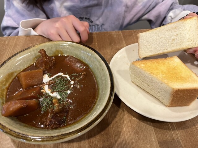 頼んだのは、トーストの上にカレーとカツが乗っているものと、「ろくろの賄いカレー」。