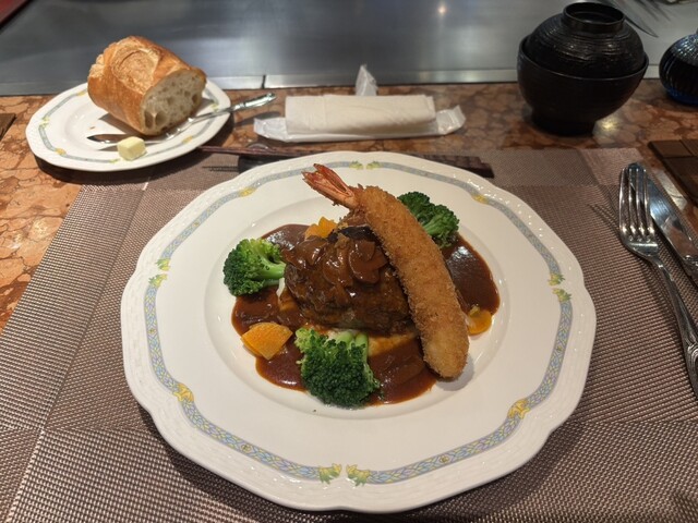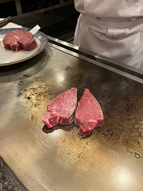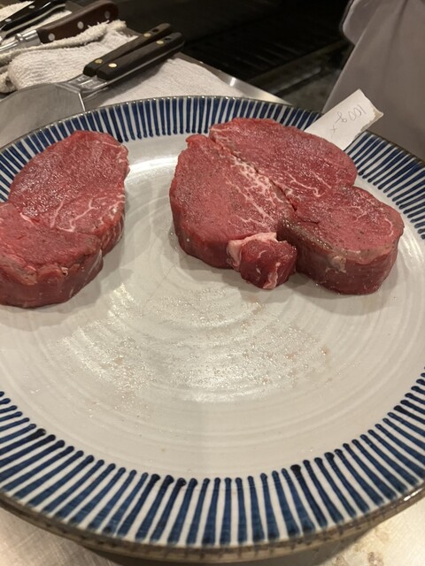 無理かなー。と思いつつ当日の直前に電話したらカウンター空いてたんで訪問。丼やハンバーグセットなどなど千円代のランチもあるけど、この辺りは平日の方が200円安いし、せっかくカウンターの鉄板前ってことでステーキがつくフルコースの陽気なマダム達の気...