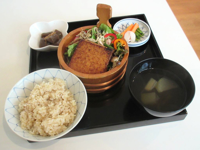 平日正午頃、他の店で昼食を取る予定で移動中でしたが、この店のランチメニューの看板でこの日の「369定食(税別850円)」の内容が「スイスチャードの葉巻きおむすび定食」と知り、興味が湧いて利用しました。 先客は女性1人で、後から女性1人が来店しました。 店の人は、女性2人の姿が確認できました。... 続きを読む»