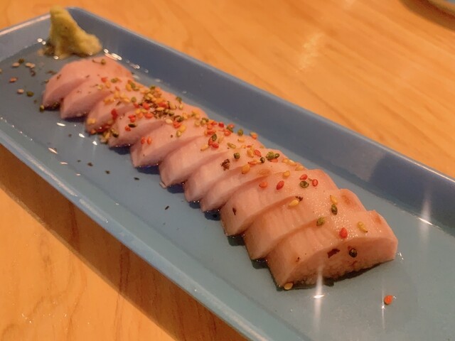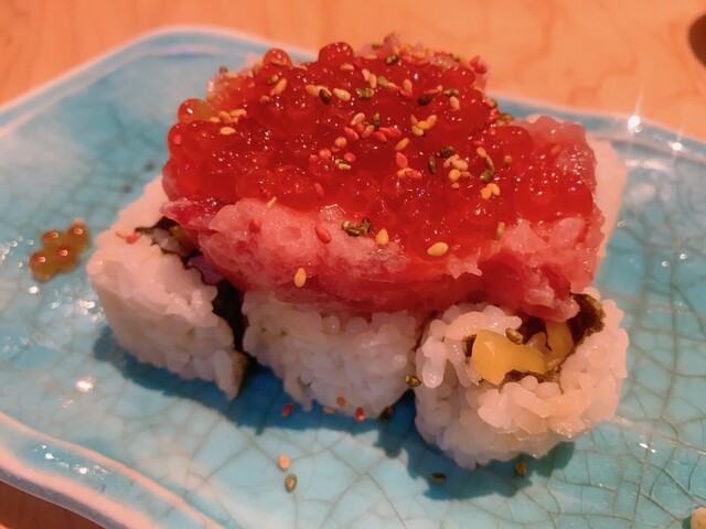 シメに頼んだトロたく巻きはトロといくらのボリュームがすごい!お寿司の太さは中巻きくらい。海苔が内側でたくわんを巻いているスタイル。最初にいくらとトロの海鮮感が口いっぱいに広がって、たくわんの食感を楽しんでるうちにふわっと海苔で磯の香りでおわっていく、正直かなり好み。ひとりで1皿いけた。