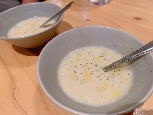 お通しはゴーヤの冷静ポタージュ!ゴーヤって珍しくない!?ほんのりゴーヤの苦味が香る大人のポタージュだったしおいしかった。家でも作ってみたい。