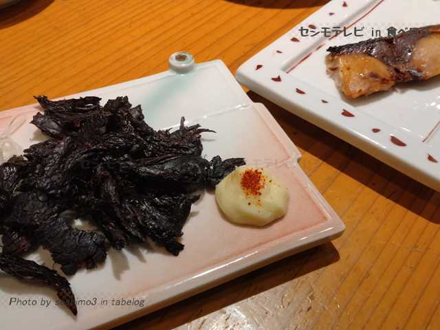 ・くじらのたれ…黒い見た目にジャーキー風の硬いおつまみながら身を噛みしめると味が豊かに出て珍味の美味しさ。