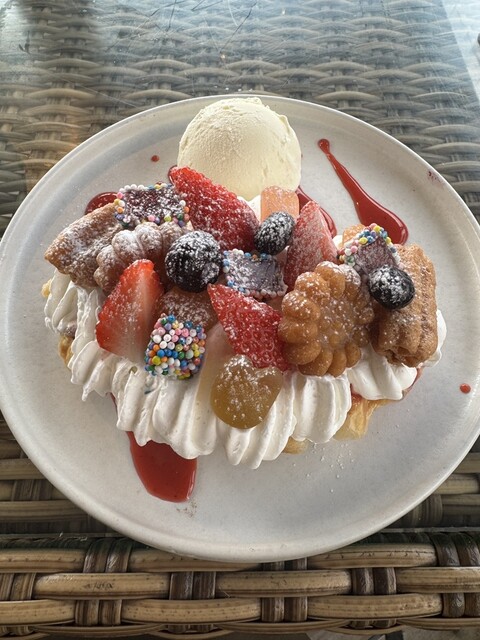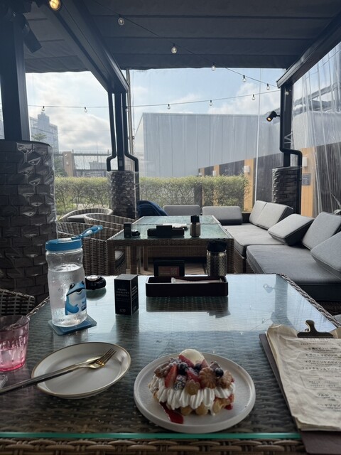 他のお店は長蛇の列でしたが、こちらは何故かすぐに案内されました。外の席ならすぐに通せるとのことで、外のお席へ。ソファ席で広々としていて今くらいの気温なら全然オッケーな感じでした。