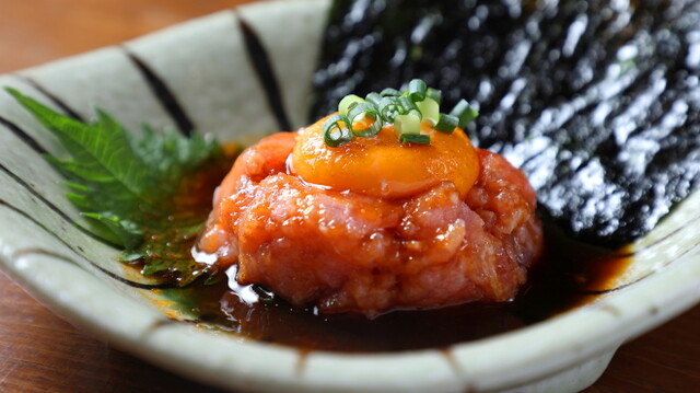 海苔で巻いて食べるネギトロユッケ (by お店)