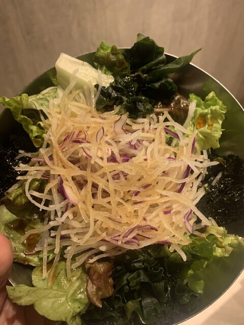 ランチで焼肉だとご飯とお肉にちょっとキムチで終わりがちだけど、ここではサラダと飲み物がついてきます