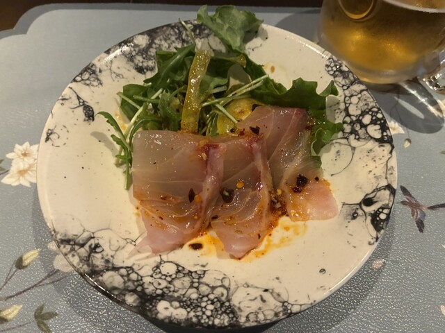 鮮魚のサラダは北海道産の白子、三重県産の生しらす、銚子の金目鯛でした。