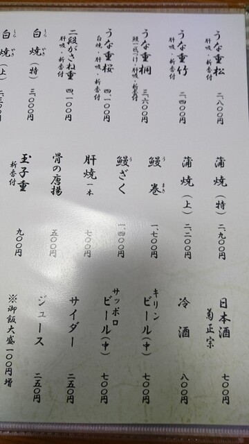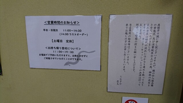 再開早々誠に申し訳ございませんが、鰻の仕入値高騰の常態化 及び消費税率引上げの為、価格の改定をさせていただきました。