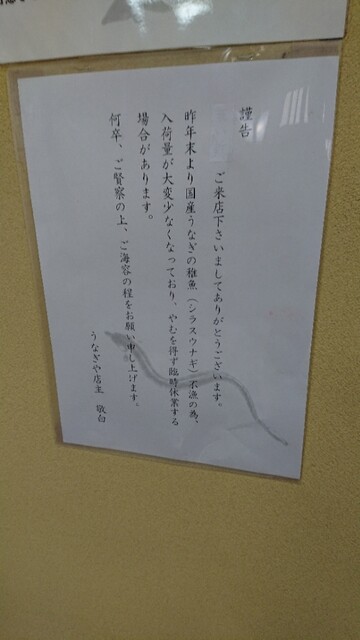 国産鰻の入荷量が少ないため臨時休業することがあるという掲示もあるので、国産鰻にこだわっているのかもしれません。