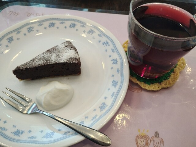 コーヒーがお勧めらしいけど、ハーブティーも何種類かあるので今回は赤いビタミンC豊富なハーブティーとガトーショコラ。美...