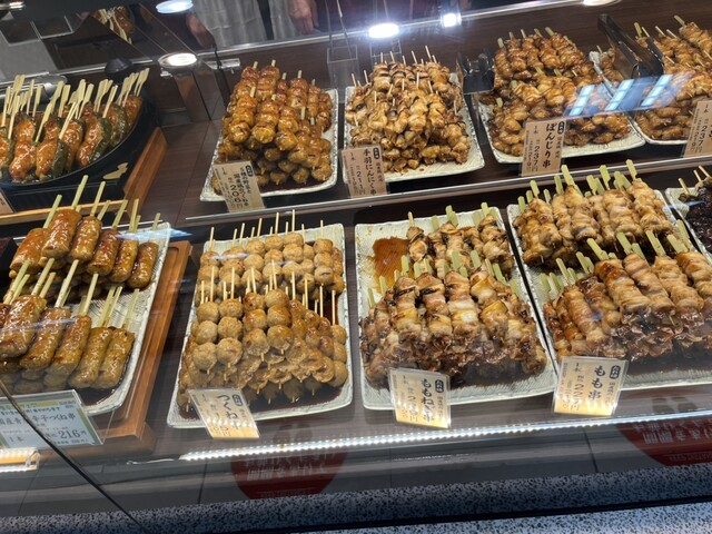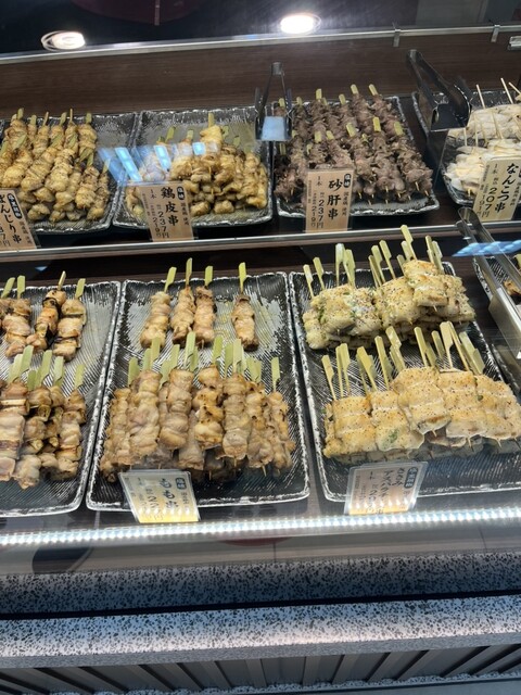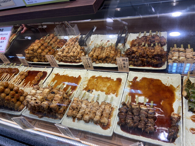 店頭のガラスケースの中には、店舗脇の焼き場で焼き立ての焼鳥やから揚げなど、店内厨房で調理した鶏総菜がずらりと並ぶ眺めは壮観。