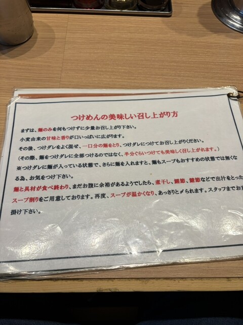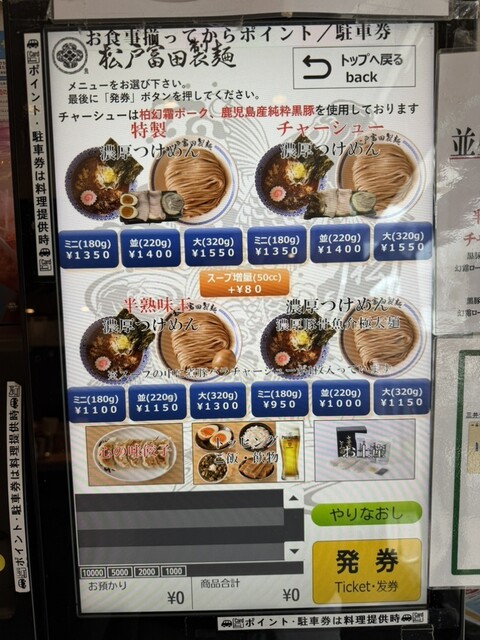 ららぽーと内の富田へランチ訪問。特製つけ麺(並220g)に、つけ汁多め(+80円)を追加して注文。