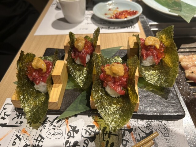 職人が厳選したA5ランクの黒毛和牛を堪能できる【肉の天山】。タンやロース、カルビやホルモンなど肉質や部位によって切り方を変え、1枚1枚丁寧に特製ダレで揉み込んでおります。お米は、釜でふっくらと炊き上げた銀シャリを使用。オーダーを頂いてから仕上げるシャキシャキの生キムチとの相性も抜群です◎店主が調理する様子を目の前で見られる特等席のカウンター席や、プライベート感のある完全個室もご用意しております!