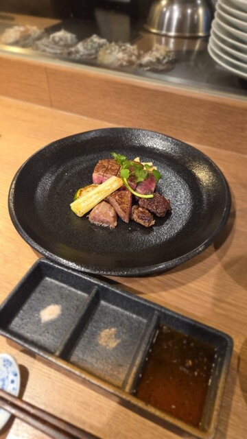 A4・A5ランクの黒毛和牛や、新鮮なアワビを鉄板焼きで楽しめる【鉄板焼 九九】。高級感から堅苦しくなりがちな鉄板焼きを誰でも気兼ねなく楽しんで欲しいという思いを持って、オーナー兼料理人の永山氏が2020年5月にオープンさせました。2023年3月に移転した店舗では、温かな雰囲気は変わらず、より洗練された和モダンな雰囲気に。お肉の部位や温度など、状態を見極めて焼かれた『黒毛和牛ステーキ』は、旨み...