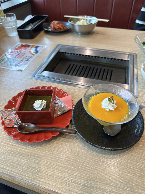 コースを食べ終わった後はデザートにマンゴーと抹茶プリンをいただきました。