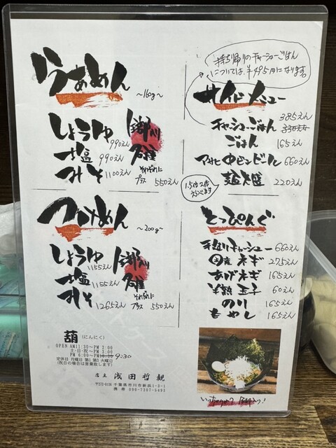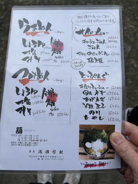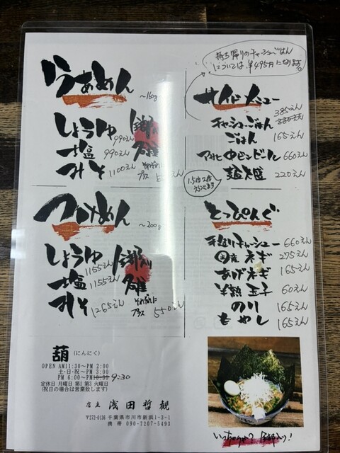 10年前あの知る人ぞ知る松戸の有名店「奥村屋」の奥村巧氏に唯一認められた弟子、店主浅田哲観。作り方では無く姿勢を学び、独学でスタートし一から味を追求。ここでしか食べれない味があります!おいしいラーメンを食べて頂きたく利益を考えず、厳選したこだわりの素材を使用。何時間も丁寧に炊き出した豚骨スープに、厳選した数種類の野菜などを合わせたスープです。ベジポタながらに濃厚な旨みが詰まった一杯です!!野菜の甘みが女性にも人気です♪エネルギー充電したい方にはニンニクがおすすめ。ニンニクをいれると味が締まるよう計算されて作られているので、是非一度お試しください!!!皆様のご来店お待ちしております♪また10月4日葛西に【葫3号店OPEN】葫で修行を積んだ熟練者が独立!!葛西でも葫の味が楽しめます。皆さまご来店お待ちしております。※「葫」15年やり初めて求人募集!独立したい方おススメ♪詳しくはご連絡下さい※ |