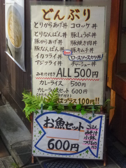 店先にどんぶり みそ汁付きALL500円って看板を出してます。