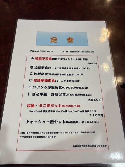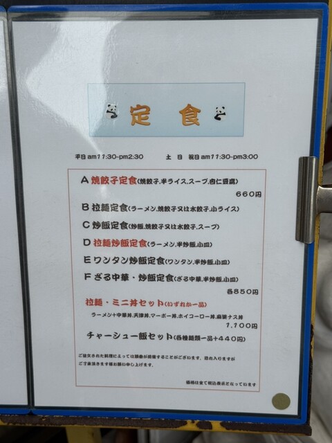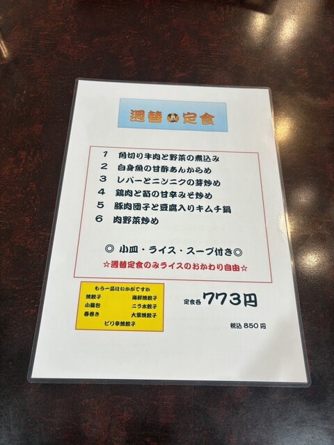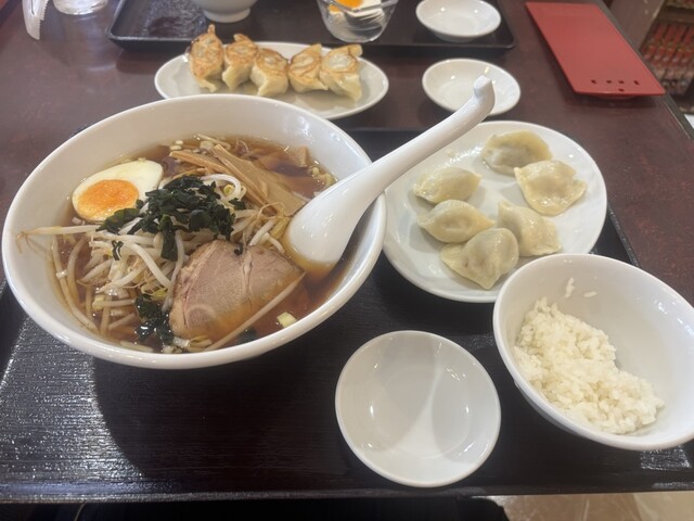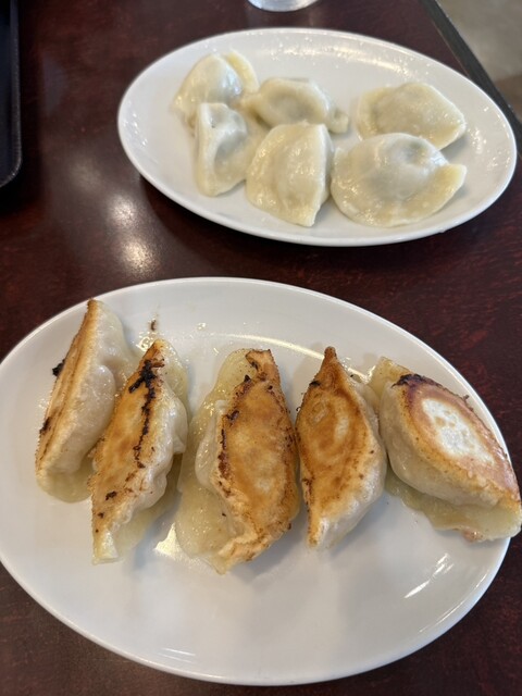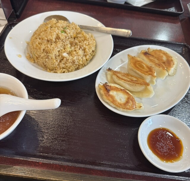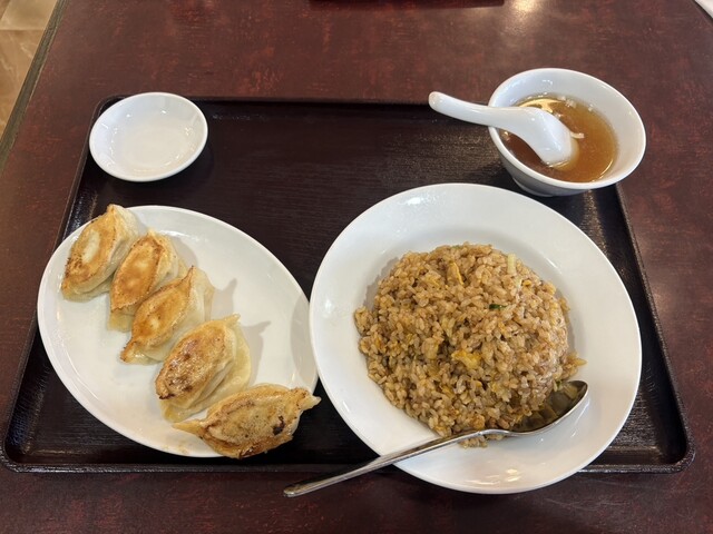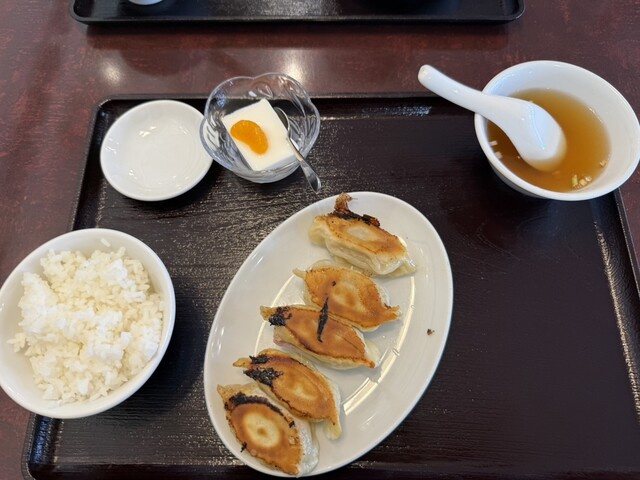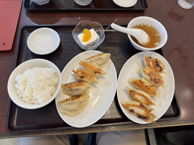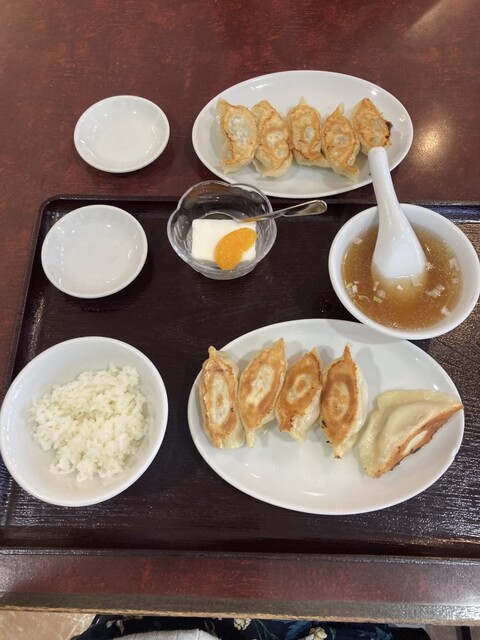 訪店平日11時38分、店内在客6名、入店すると「空いている席にどうぞ」と店員さんからの声。さっそく空いている席に着座し、メニューを拝見。ランチタイムは色々なサービス定食メニューがあって、嬉しい限りです。ここは目的の焼餃子がメインの「焼餃子定食」をチョイス。が、炒飯も食べたくなり「炒飯定食」と迷っていると、炒飯定食は水餃子もチョイスできると書いてあったので、ついつい「焼餃子定食」と「炒飯定食」の両方...