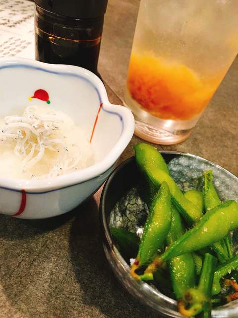 お通しで小鉢が2品(しらすおろし、切り干し大根)。
