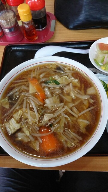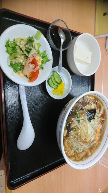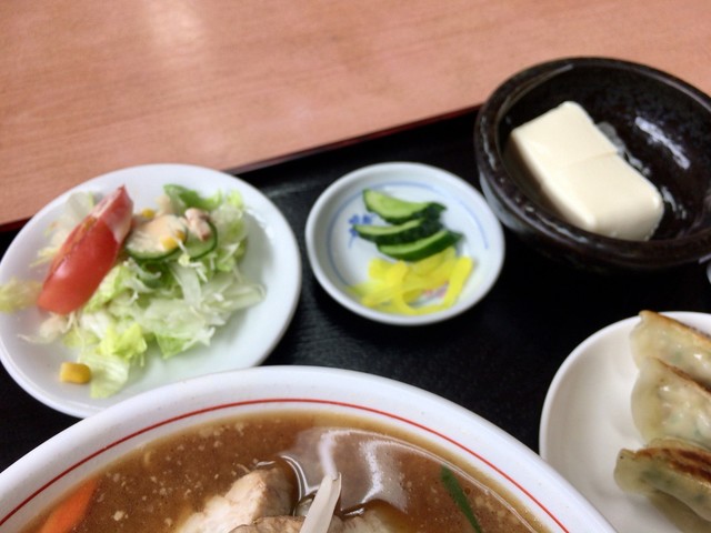 当店は、スタミナラーメンを単品で頼んでもサラダ、小鉢、漬物、デザートがついて来るサービス満点のお店です。今回はスタミナラーメンに餃子3個付けて丁度1,000円也