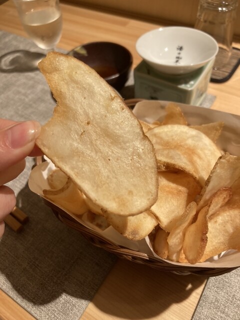自家製ポテトチップスは芋の柔らかさを残した半チップスのような仕立てでありこれが中々美味い。