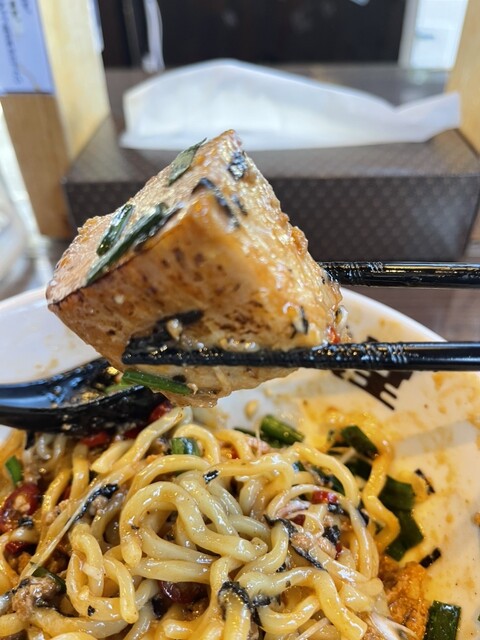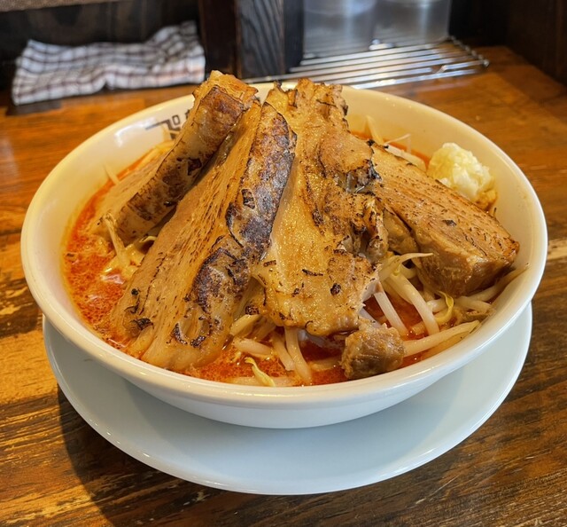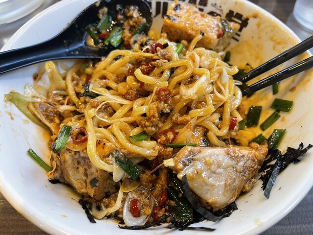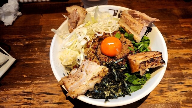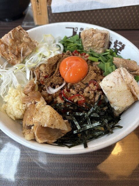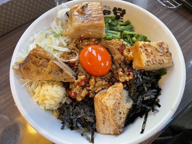 平日お昼、11時半ごろに着きましたが、待ち列が隣のマンションまで伸びていました。ラーメン店なので回転は早く数分で入れました。 3度目の今回は、まぜそばを注文。 盛り付けが素... 詳細を見る