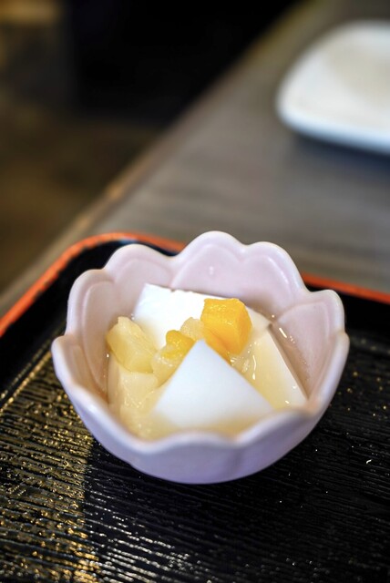 定食にはわかめスープ、杏仁豆腐、ザーサイ、酢漬けが...