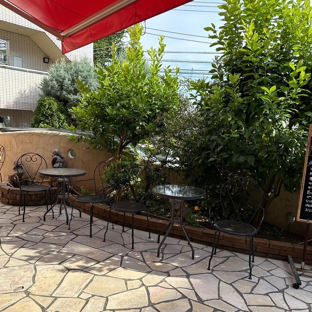 (お店の外にテーブル5つと椅子が15,6席程あります) |