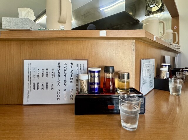 本当に久しぶりにお店に伺いまいました。コロナ渦後の2023年4月に訪れて、その後長期の休業が続き本日、満を持してこちらのお店にやって参りました。前回、訪れた時は“チャーシュー“を“あごだしらーめん“に載せていただきましたが、現在基本のお味は、"煮干しらーめん"、"あごだしらーめん"、"節仕込みらーめん"の3種。現在、チャーシュー増しのトッピングも止めています。