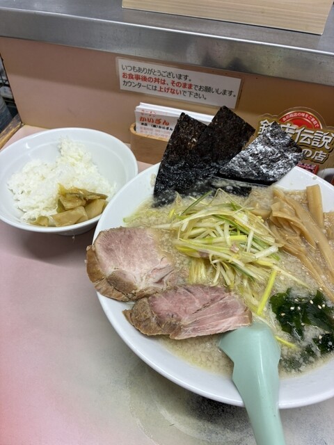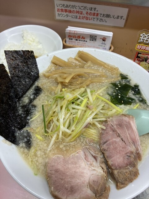 幕張メッセの帰りにラーメンが食べたくなり、かいざん本店さんに訪問。18時半位の訪問でしたが待ち無し。券売機でネギチャーシューラーメンとネギ丼を購入し着席、麺硬めでオーダーします。その後続々と来店者がお...