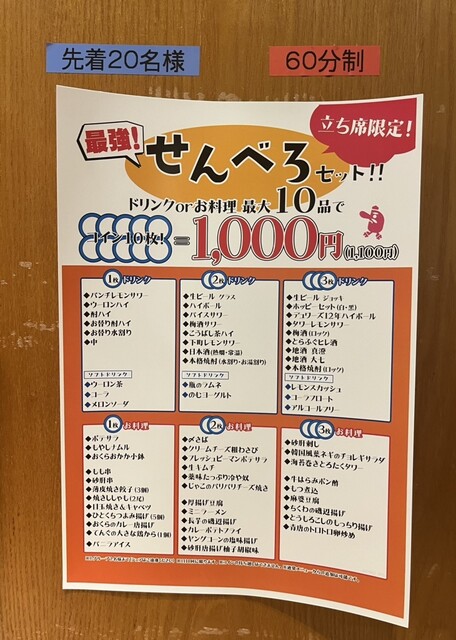 先着20 名の立ち飲み限定企画の1,100円税込。