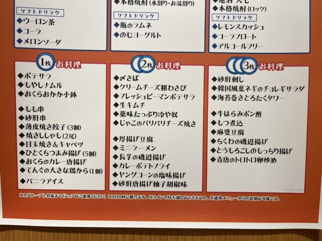 1〜3枚で設定された飲み物とおつまみを10枚以内で自由に組み合わせる方式。