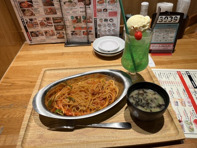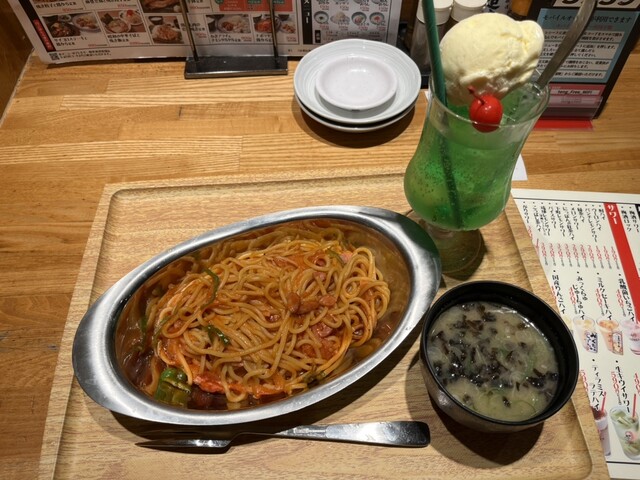 ナポリタンと、メロンクリームソーダにお味噌汁のセット。