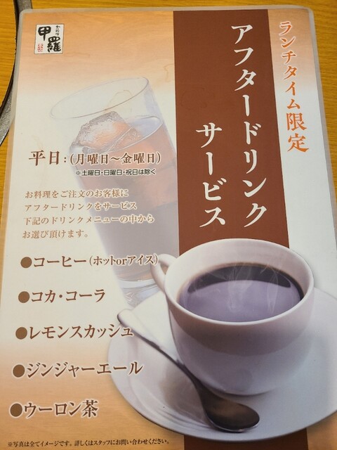 平日のランチタイム限定でアフタードリンクサービス中(ホットコーヒー・アイスコーヒー・ウーロン茶・コーラ・ジンジャーエール・レモンスカッシュ)