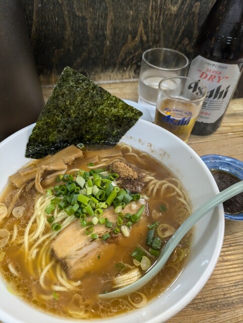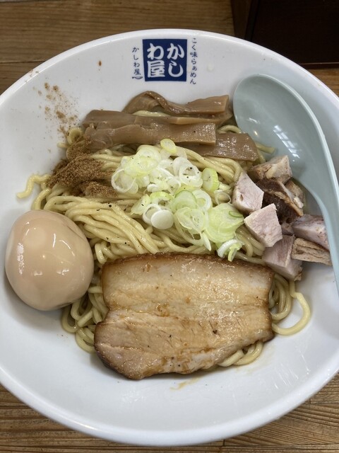 一階はラーメン専門店。二階はちょい飲みかしわ屋として営業しています。月〜土曜日、17時〜23時まで、西口降りてすぐの駅近で煮干しの香りが漂うお店。柏エリアトップクラスの3種煮干し豚骨醤油スープラーメンは絶品!もちもちの自家製太麺が自慢の油そばが食べられるお店です。豚バラチャーシューにモチモチ太麺。
