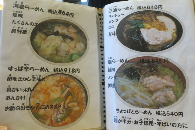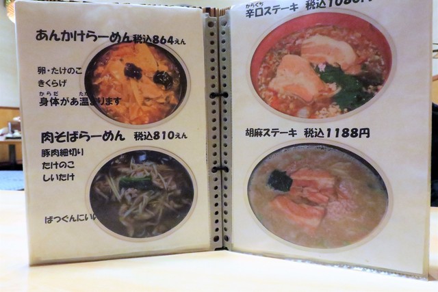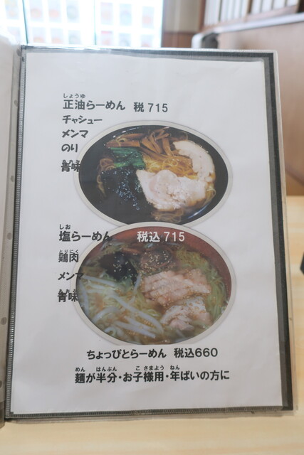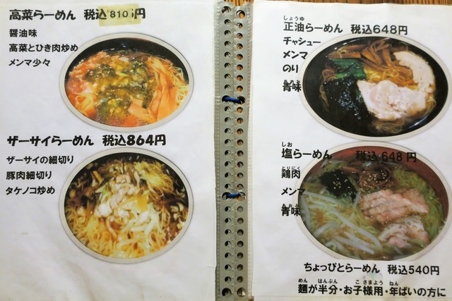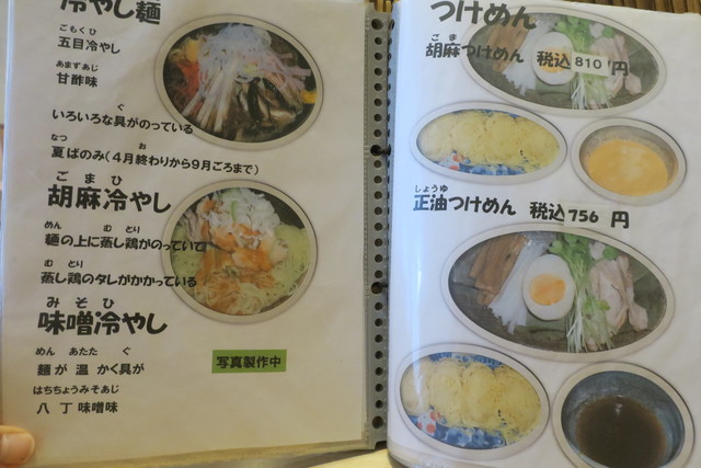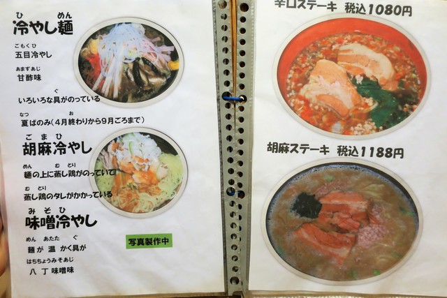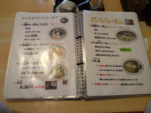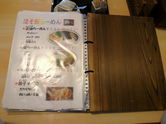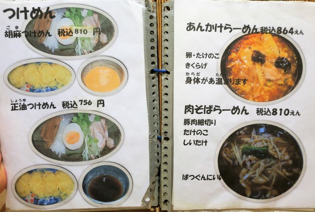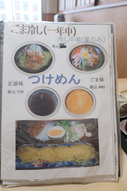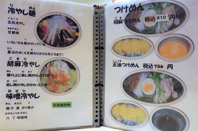 基本メニューは、らーめん(正油、塩、味噌)、つけめん(胡麻、正油)等