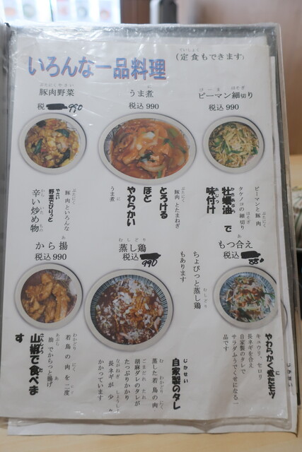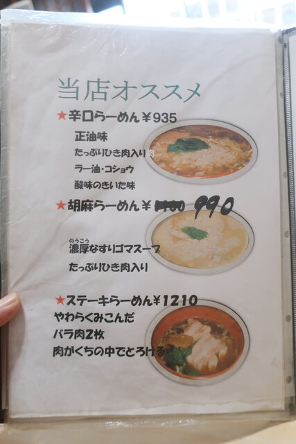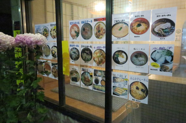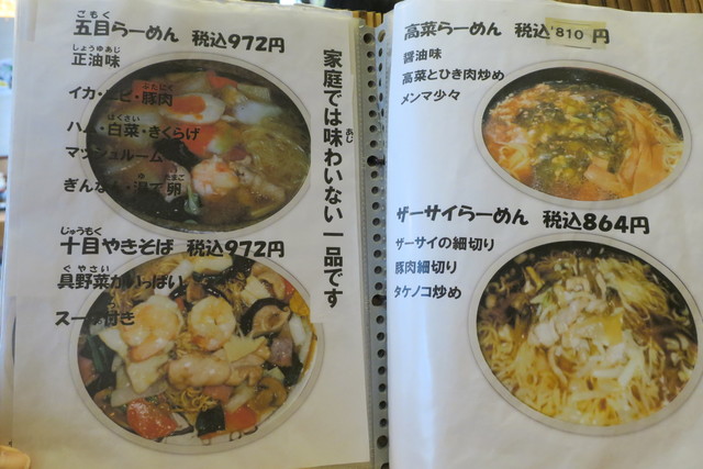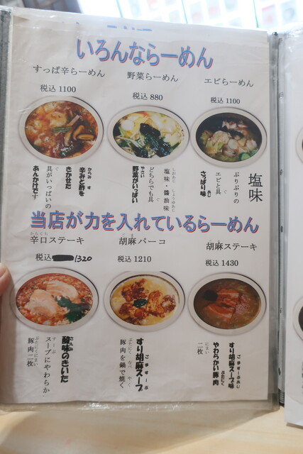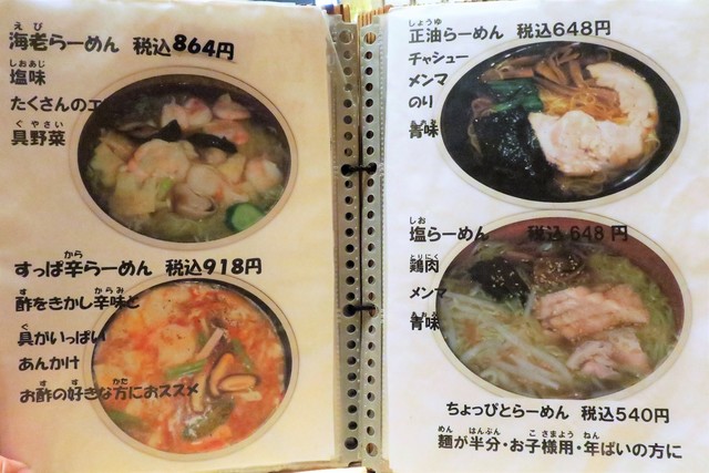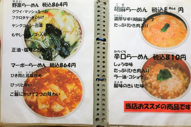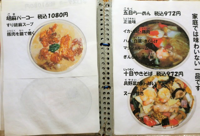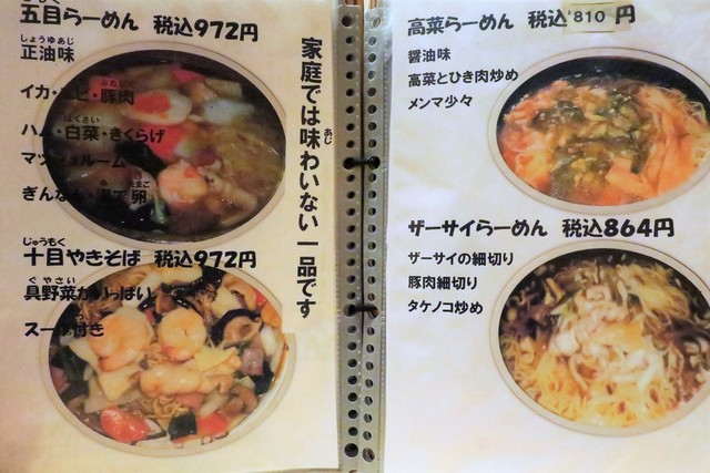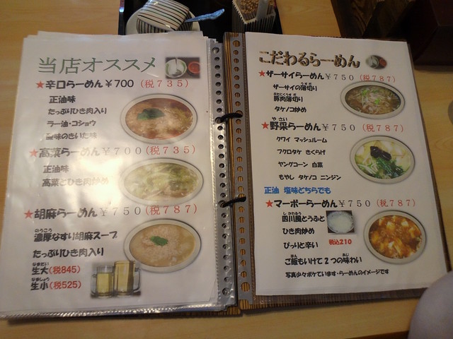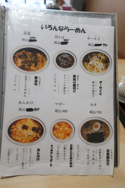 基本メニューは、らーめん(正油、塩、味噌)、つけめん(胡麻、正油)等