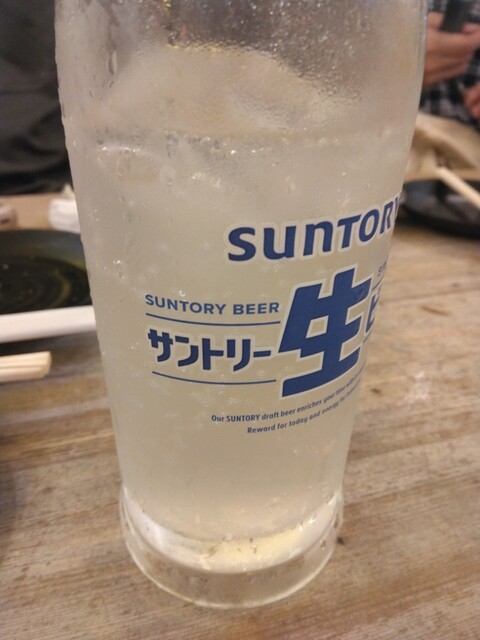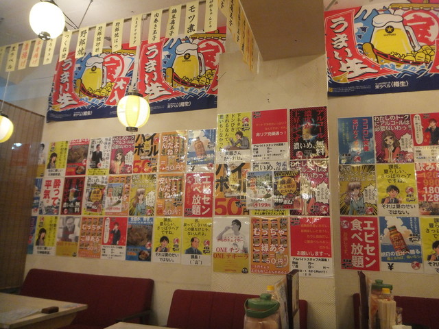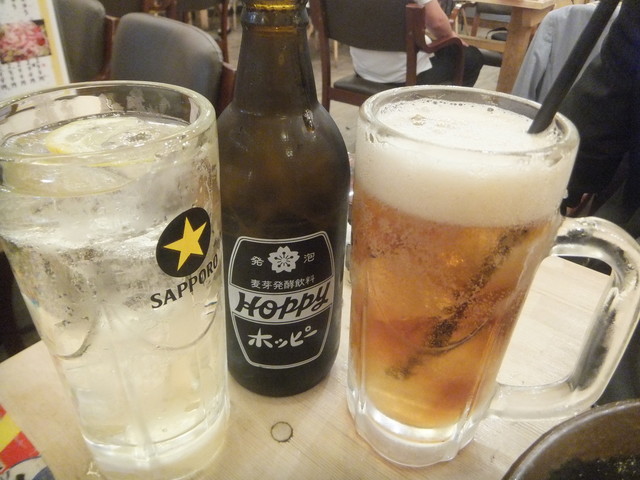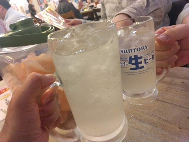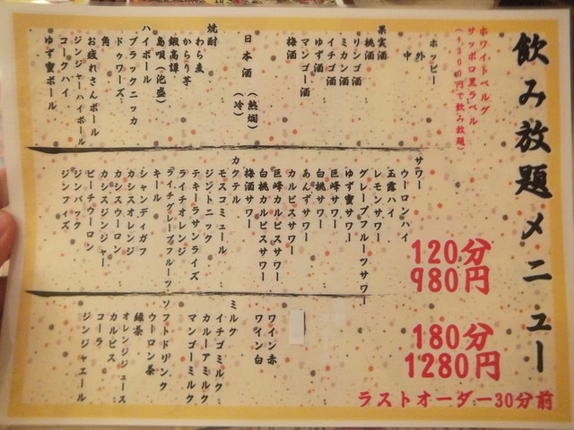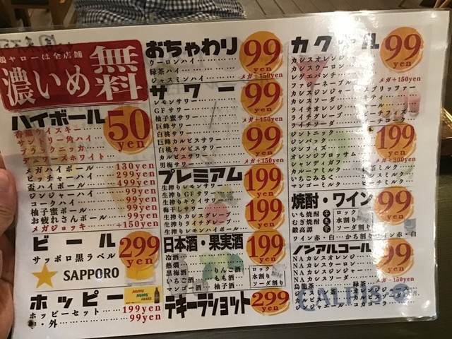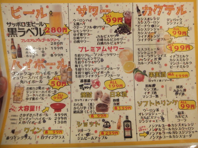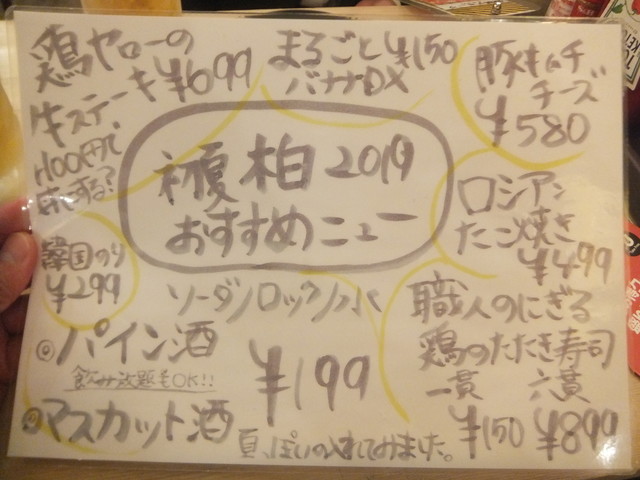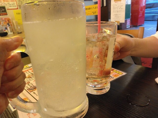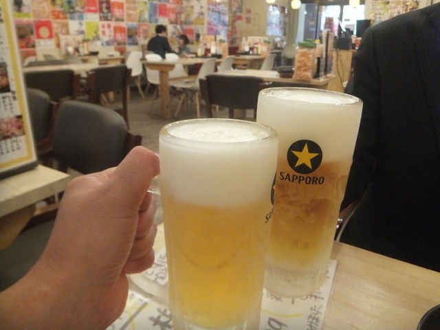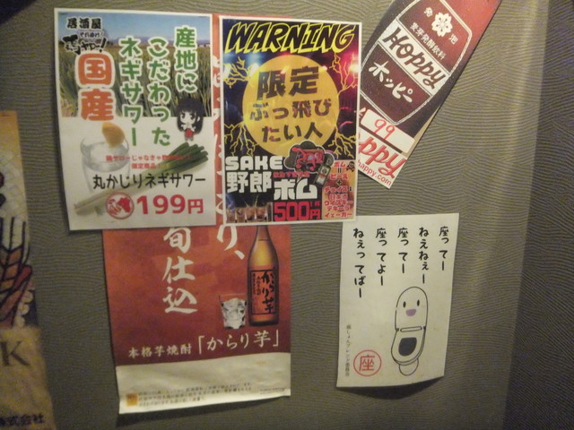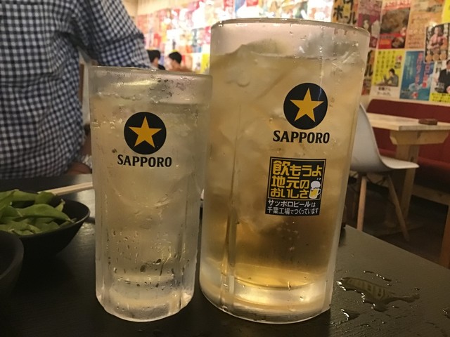 奴氏が会社の健康診断の後で柏に来て、ドライブに行った帰りに利用しました。平日金曜日、18:32の来店で既に結構混雑しています。このお店、圧倒的に安いので、若いお客さんを中心にかなり混雑します。若いお客さんが多いからかかなり騒々しく、そのためか本当に若いお客さんばかりが来店して・・・我々40代のお客さんすら殆どいません。つまりアウェイな環境ではあります。
